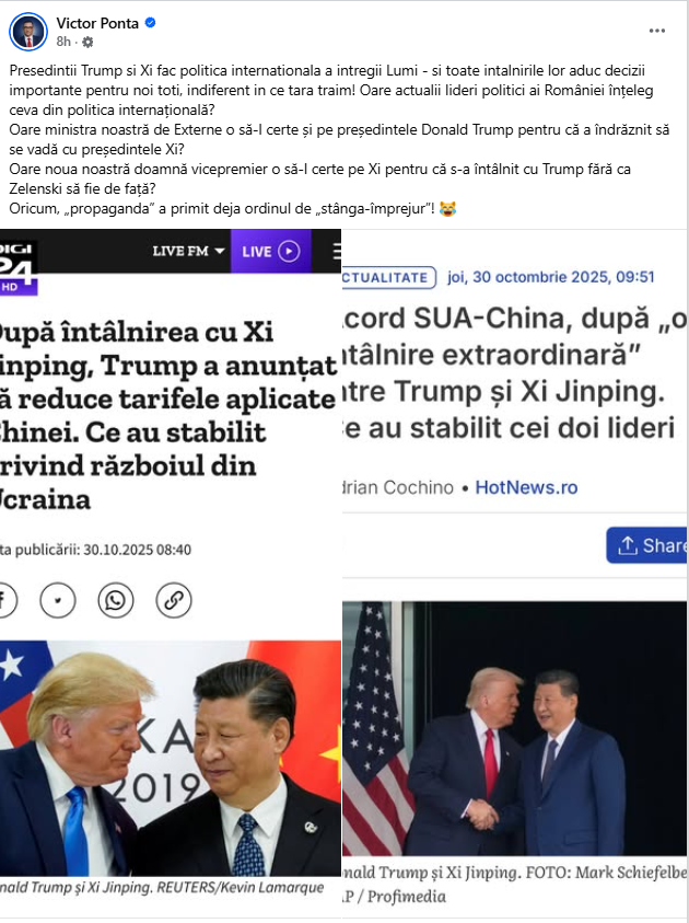 Victor Ponta atrage atenția asupra importanței întâlnirilor dintre președinții Trump și Xi, care influențează deciziile globale pentru toate țările. Fostul premier se întreabă dacă actualii lideri politici români înțeleg cu adevărat mecanismele politicii internaționale și consecințele deciziilor majore. El critică eventualele reacții ale oficialilor români, sugerând că unii ar putea „certă” liderii mondiali pentru întâlnirile lor, ignorând contextul global. Ponta pune în discuție rolul Ministerului de Externe și al noii vicepremier în raport cu acțiunile liderilor mondiali, evidențiind absurdul unor eventuale reacții publice fără sens. El subliniază că propaganda internă deja a primit ordine de manipulare, încercând să interpreteze evenimentele internaționale în funcție de interese politice interne.