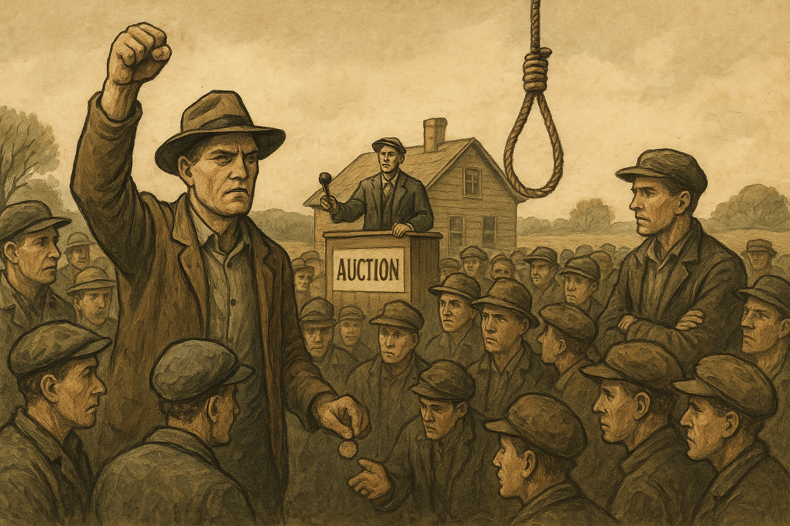 În unele locații, la licitații se atârnau funii de spânzurătoare. Acestea avertizau pe oricine ar fi depășit suma convenită. Solidaritatea și curajul comunității depășeau frica. Licitațiile de un cent deveneau simboluri ale demnității în fața disperării. Salvarea unei ferme nu era doar economică, ci și un act de apărare a modului de viață.
