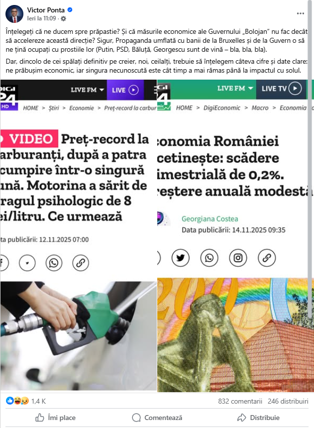 Într-o postare recentă pe rețelele sociale, Victor Ponta avertizează că România se îndreaptă rapid spre prăpastie economică. Măsurile economice adoptate de Guvernul „Bolojan” accelerează declinul și nu oferă soluții reale pentru redresare. Propaganda oficială, susținută cu bani europeni și guvernamentali, distrage atenția cetățenilor de la problemele reale ale economiei. Ponta menționează că, în loc să se concentreze pe politici eficiente, guvernanții caută vinovați pentru situația actuală, arătând cu degetul spre Rusia, PSD sau diverse persoane publice. Totuși, avertizează el, adevărata problemă nu sunt țintele propagandistice, ci cifrele și datele economice reale, care indică o prăbușire iminentă. „Trebuie să înțelegem gravitatea situației și să acționăm înainte de impactul cu solul”, subliniază Victor Ponta. El atrage atenția că singura necunoscută este cât timp mai avem înainte ca efectele economice să devină dezastruoase pentru populație și mediul de afaceri. Postarea este un apel la responsabilitate și la conștientizarea pericolelor ascunse sub „hârtia frumos ambalată” a propagandei guvernamentale.