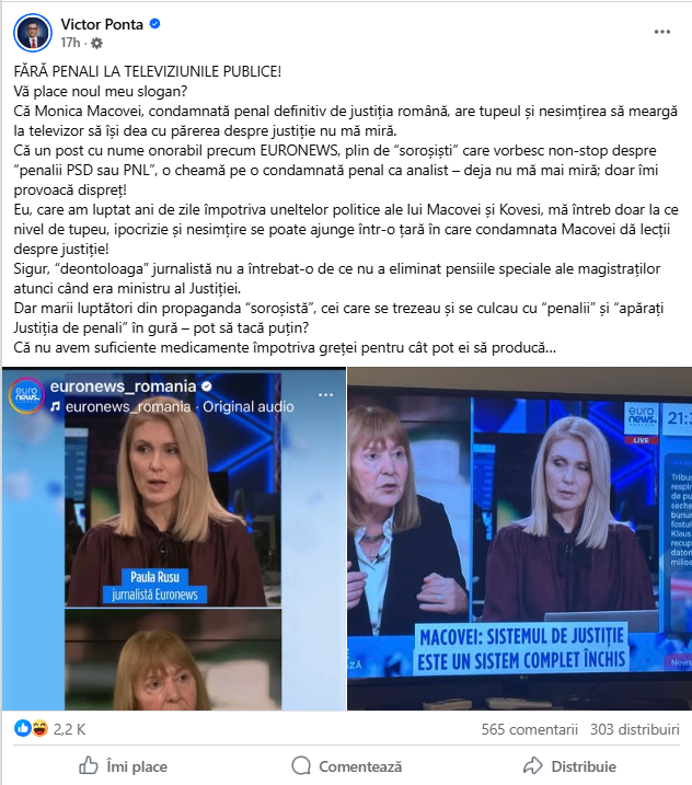 Victor Ponta lansează un mesaj clar: „Fără penali la televiziunile publice!” și întreabă retoric dacă publicului îi place noul slogan. El critică dur prezența Monicăi Macovei, condamnată penal definitiv de justiția română, care continuă să își dea cu părerea despre justiție la televiziuni. Ponta subliniază că un post respectabil precum EURONEWS, plin de „soroșiști” care critică penalii PSD sau PNL, o cheamă pe Macovei drept analist. Aceasta situație, spune Ponta, nu îl miră doar, ci îi provoacă dispreț profund. El amintește că a luptat ani de zile împotriva uneltelor politice ale Monicăi Macovei și ale lui Kovesi și se întreabă la ce nivel de tupeu, ipocrizie și nesimțire se poate ajunge într-o țară unde o condamnată penal predă lecții despre justiție.