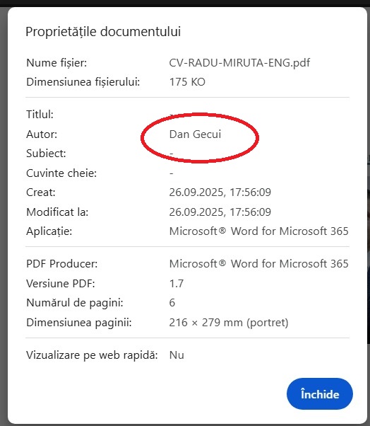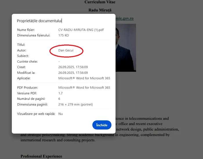 Ministerul Economiei a ajuns o afacere de familie sub conducerea lui Radu Miruță. CV-ul ministrului a fost redactat de soțul șefei de cabinet, pe care Miruță o plimba pe banii străinilor și o numește în CA-uri bănoase. Soțul Ioanei Răduca, Dan Gecui, nu are nicio calitate oficială în minister. Neregulile nu vizează studiile lui Miruță, ci persoana care a redactat CV-ul. Pe metadatele documentului oficial apare autorul: Dan Gecui, soțul consilierei lui Miruță. Aceasta scoate la iveală implicarea familiei Răduca-Gecui în instituția publică. Miruță ocupă și funcția de ministru interimar al Apărării, după demisia lui Ionuț Moșteanu. Ministrul Economiei și-a publicat CV-ul pe site-ul oficial. Una dintre facultăți a fost urmată „ca hobby”, conform documentului. Autorul CV-ului, Dan Gecui, nu deține nicio funcție guvernamentală. Singura sa legătură cu Ministerul Economiei este soția sa, Ioana Răduca.