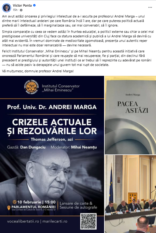 Victor Ponta a declarat că a participat la o întâlnire academică susținută de profesorul Andrei Marga. El a apreciat statura intelectuală a profesorului și importanța reperelor academice autentice. Victor Ponta afirmă că mediocritatea zgomotoasă domină astăzi educația și politica. În acest context, prezența unui intelectual veritabil devine necesară pentru dezbaterea publică. Fostul premier consideră că valoarea academică este adesea ignorată de puterea politică actuală.