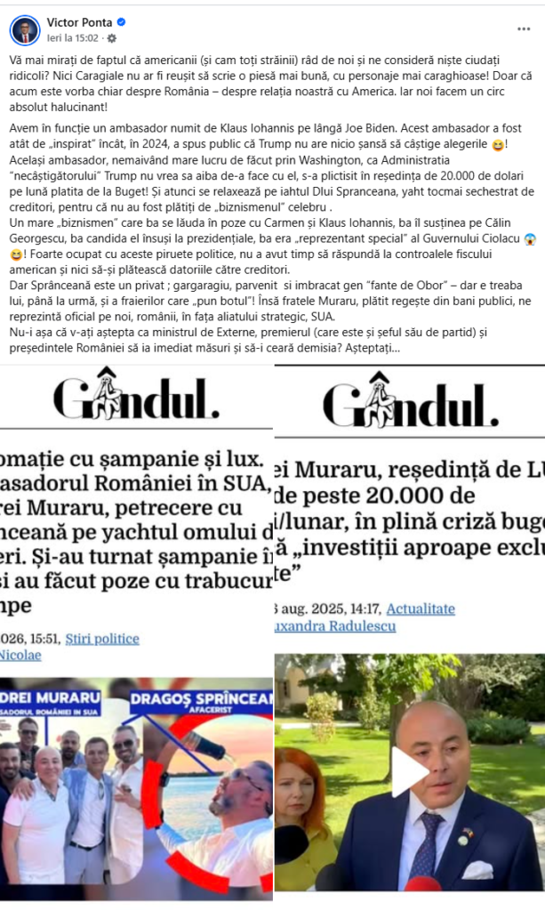 Victor Ponta face referire la ambasadorul României la Washington, numit în mandatul lui Klaus Iohannis. El amintește o declarație publică din 2024 privind șansele electorale ale lui Donald Trump. Fostul premier afirmă că relațiile diplomatice trebuie gestionate cu prudență și echilibru. El susține că reprezentarea externă implică responsabilitate publică majoră.