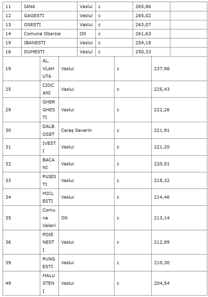 Multe comune din județ nu își pot acoperi salariile angajaților din veniturile proprii.Ferești are printre cele mai mici venituri din țară, cu 1.595.493 lei încasați.În unele localități, cheltuielile salariale depășesc considerabil veniturile proprii.La Coroiești, procentul salariilor din venituri ajunge la 354%. La Pogonești, cheltuielile salariale reprezintă 283% din veniturile proprii. La nivel național, 1.104 localități au salariile mai mari decât veniturile totale. Din 3.182 de localități, una din trei cheltuie mai mult pe salarii decât încasează. Datele analizate se referă la exercițiul bugetar complet din 2024. Veniturile proprii includ sume defalcate din impozitul pe venit pentru echilibrare. Acestea includ și fonduri repartizate de consiliile județene pentru diverse finanțări.