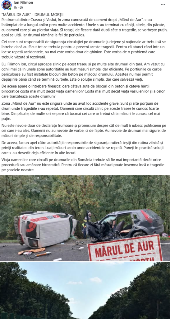 Liderul local afirmă că zona „Mărul de Aur” nu este singura problematică. Mai există și alte porțiuni de drum unde accidentele se repetă. Șoferii care circulă zilnic cunosc aceste locuri periculoase. Ion Filimon face apel la autoritățile responsabile de siguranța rutieră. El cere măsuri concrete și rapide. Potrivit acestuia, viața oamenilor trebuie să fie mai importantă decât procedurile birocratice.